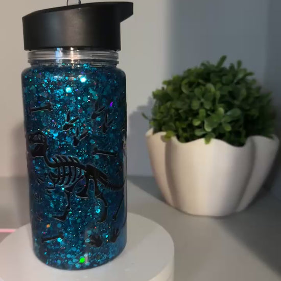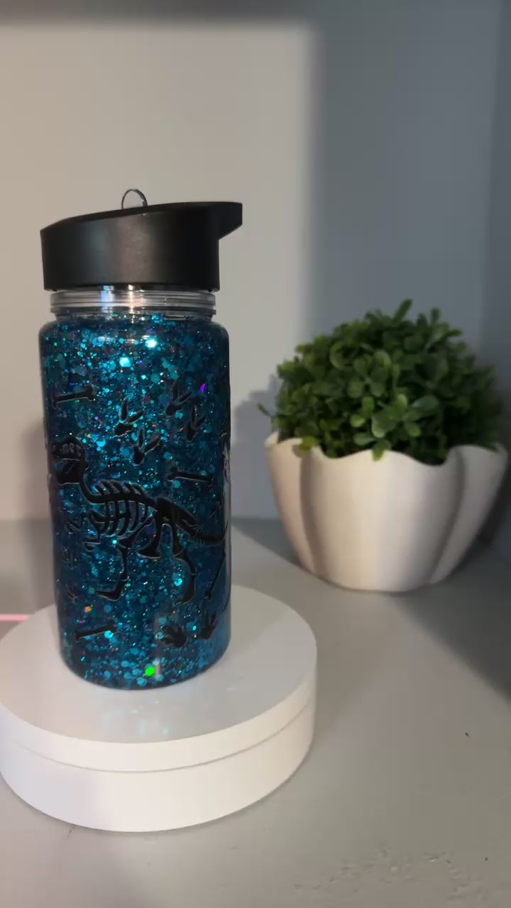 Make hydration fun with this 10oz snow globe water bottle! Features sparkling blue glitter and dino fossil designs—perfect for little adventurers. Comes with a flip-top lid for easy sipping.